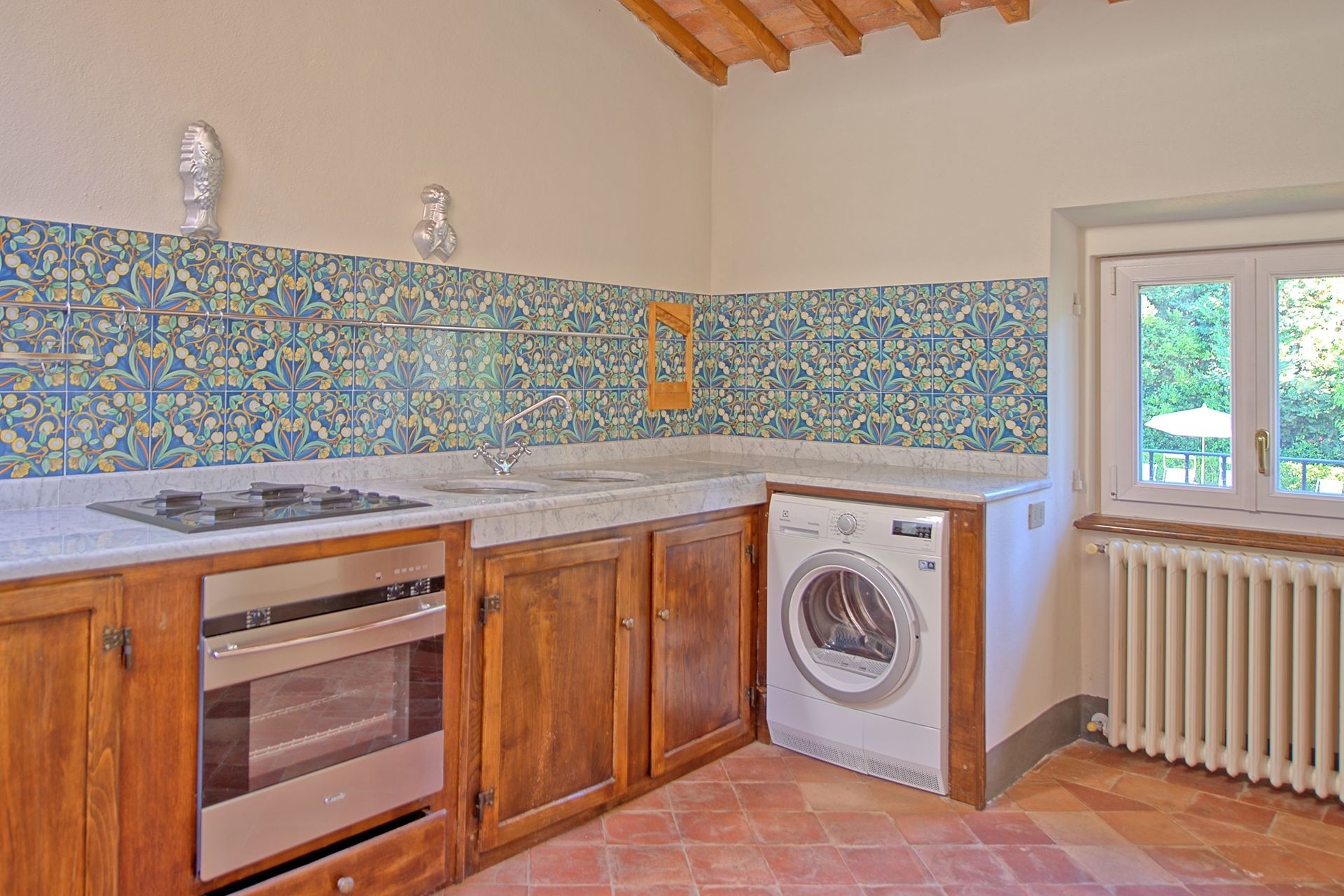 B.G.: entree, ruime keuken (vriezer, oven, professionele oven, vaatwasser, magnetron, snijmachine, Espresso-apparaat, ijsblokjesmachine) met niet bruikbare open haard en toegang naar buiten.
