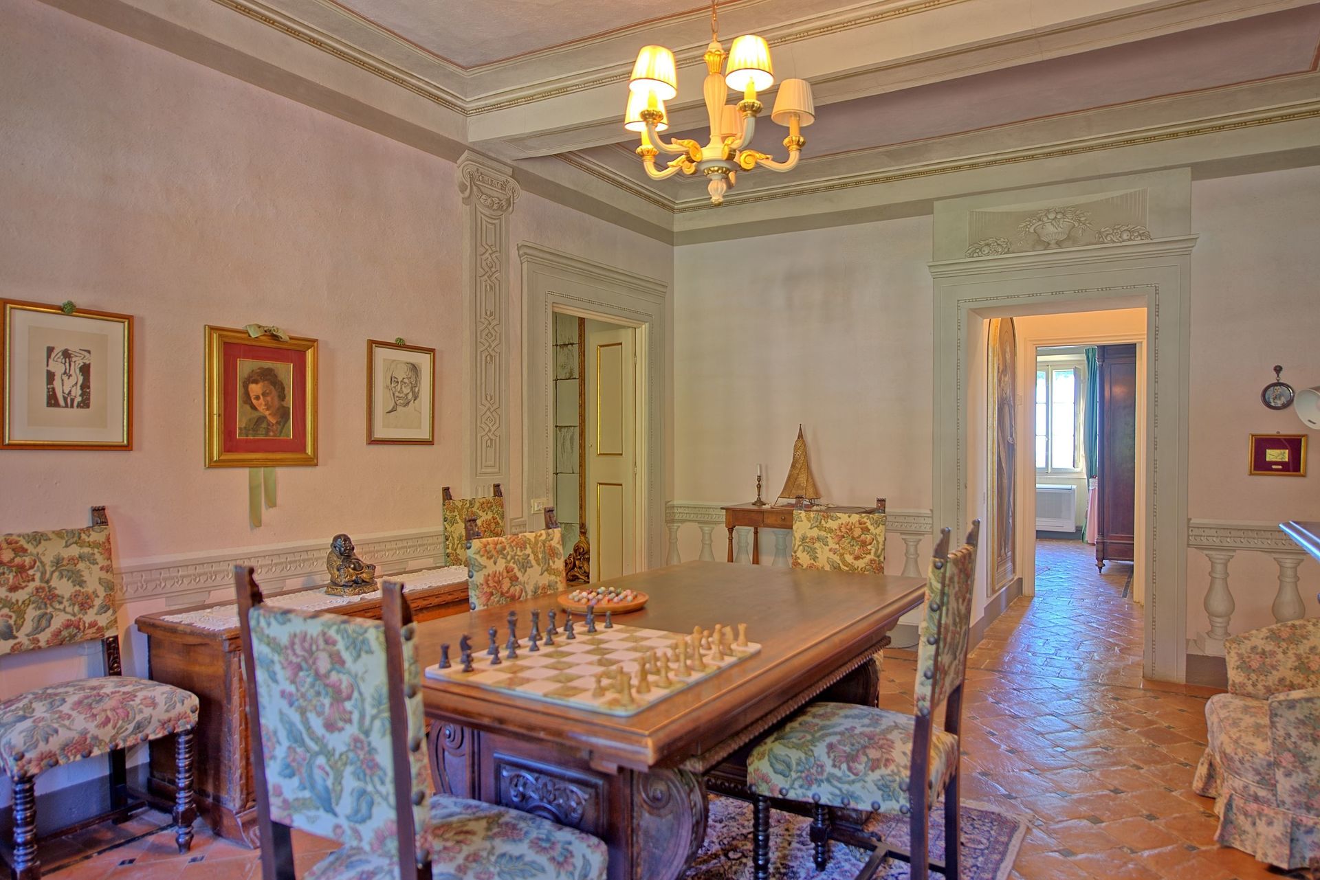 3 treden lager: eetkamer, biljartkamer.