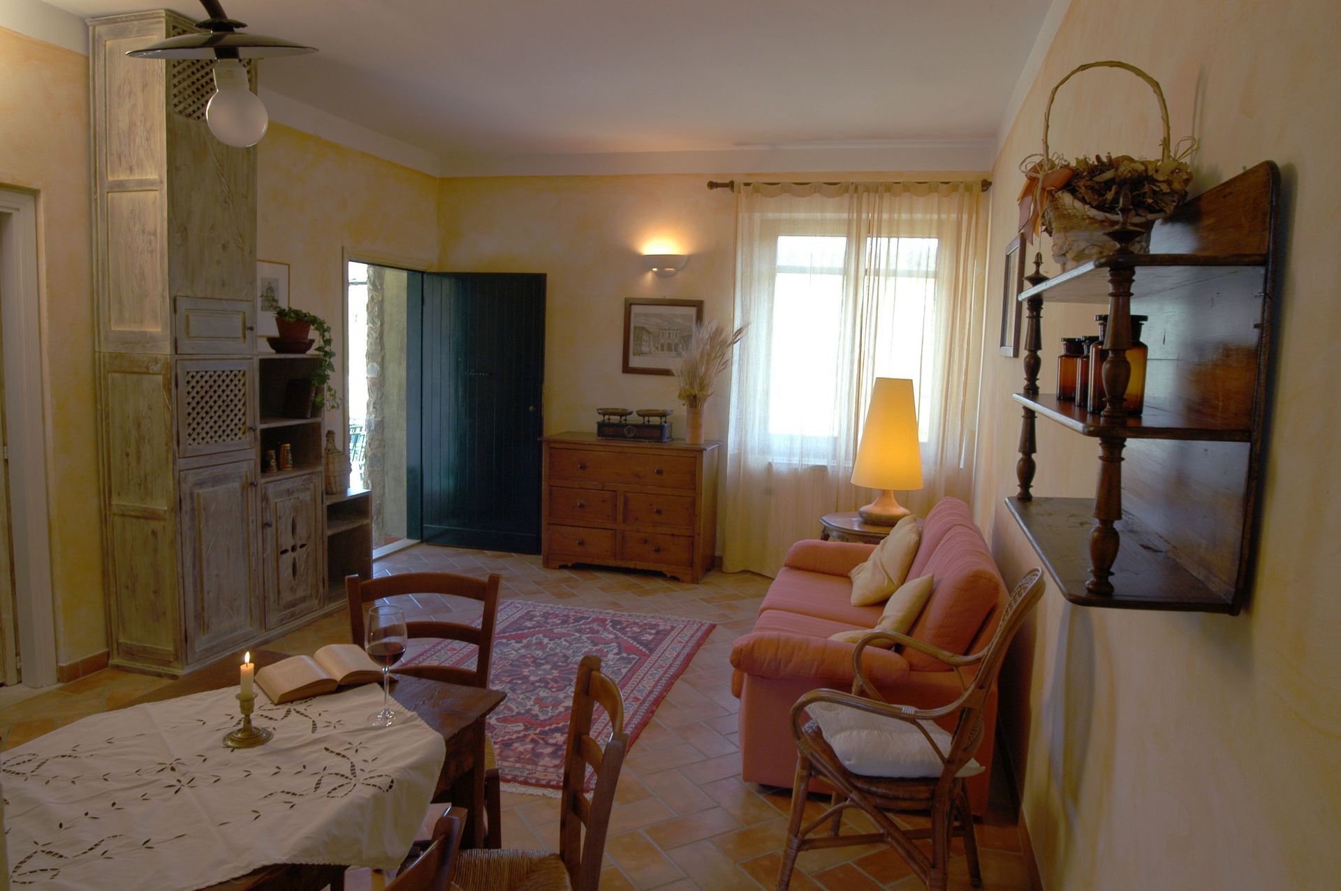 on the ground floor ( 45 sm.) with 1 large bedroom, ceiling fan, a living room and a kitchenette, Tv-sat, 1 bathroom with shower or bathtub, independent heating, furnished terrace overlooking the valley, parking, WiFi.
