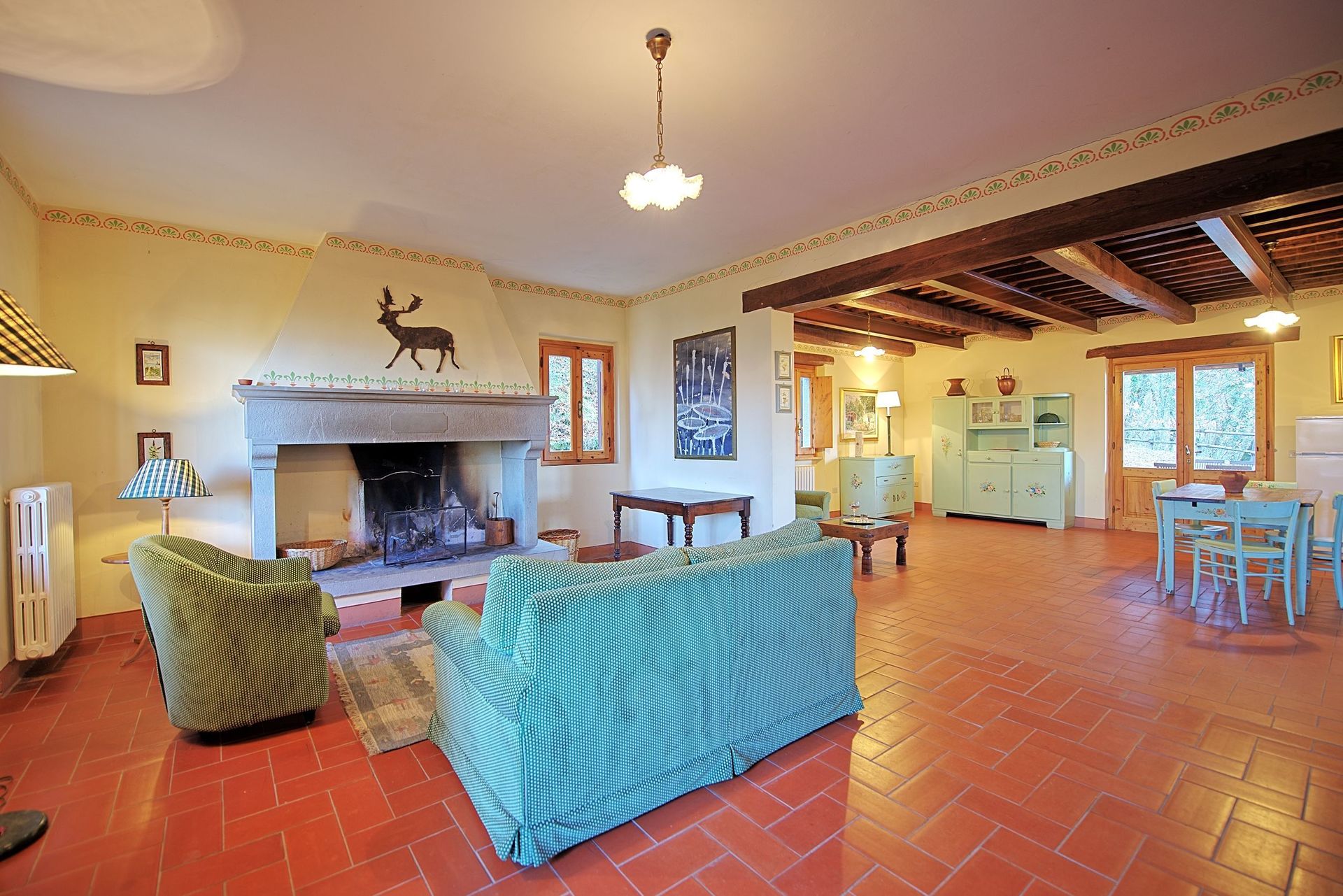 Ground floor: large living room with fireplace, dining area and kitchen corner (freezer, dishwasher,american coffee machine), direct access to an outdoor terrace with dining facilities as well as barbecue.